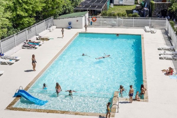 L’espace aquatique de notre camping près de Saint-Maurice-d’Ibie est un véritable atout pour des vacances réussies. La piscine chauffée à 27°C, refaite à neuf en 2018, est entourée de transats et de parasols, offrant un cadre idéal pour la détente et le farniente. La piscine de notre camping en Ardèche près de Saint-Maurice-d’Ibie comprend un grand bassin et une pataugeoire pour les plus petits, garantissant des moments de baignade en toute sécurité. Les enfants adoreront le toboggan pour des sensations fortes, tandis que les adultes pourront se détendre sur les transats sous les parasols de notre camping avec piscine en Ardèche. L’espace aquatique est situé à proximité de l’aire de jeux et du club enfants de notre camping près de Saint-Maurice-d’Ibie, permettant aux familles de profiter pleinement de leur séjour. Le bar adjacent permet de savourer des rafraîchissements et collations en toute convivialité tout en admirant la vue imprenable sur la nature de l’Ardèche.